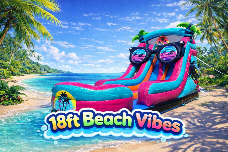 Make a splash at your next event with our 18ft Beach Vibe Water Slide! This vibrant, tropical-themed inflatable features a single-lane slide and a built-in inflated pool landing for safe and thrilling fun. Designed with Seamless Slide Technology and top-quality materials, it offers a smooth, fast ride from top to bottom. Perfect for backyard parties, school events, or summer celebrations—just add water and let the fun begin!