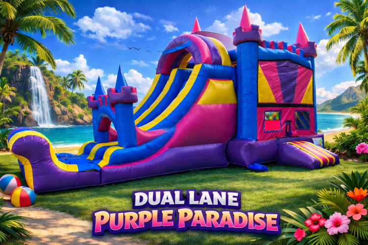 Dual Lane Purple Paradise- This unit has an amazing color scheme that any little girl is sure to enjoy. The colors are simply eye catching. And if that is not enough the kids have two lanes to race down after bouncing around in the large bounce area which also has a small basketball hoop for playing inside.