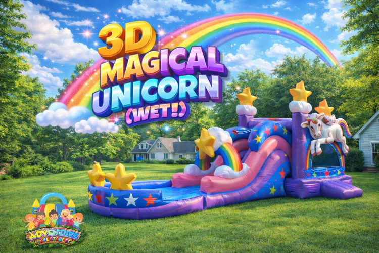 All of your guest will love this magical unicorn combo that features stars,rainbows,clouds, bright colors and the 3d unicorn. This wet/dry combination unit consist of a single lane slide with a pool at the bottom with a 13x13 bounce area with a basketball hoop and pop ups inside the bounce area.
